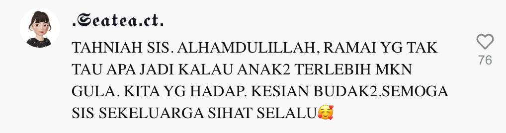 "Tahniah sis. Alhamdulillah, ramai yang tak tahu apa jadi kalau anak-anak terlebih makan gula" – Netizen