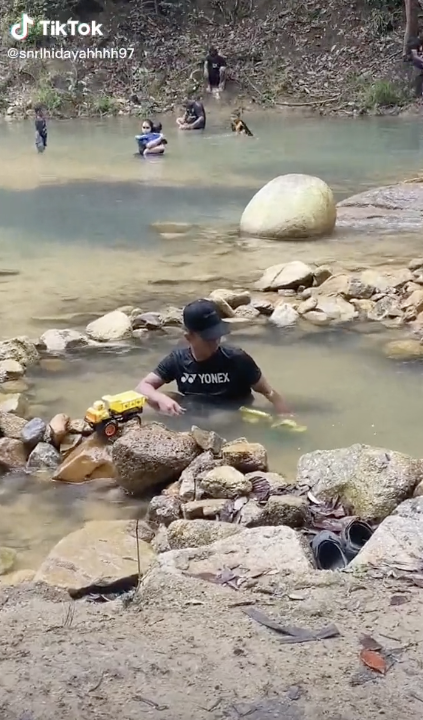 Menerusi video pendek yang dimuat naik oleh @snrlhidayahhhh97 di TikTok, kelihatan seorang lelaki sedang merendamkan badan di kawasan air terjun.
