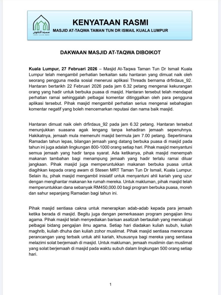 Masjid At-Taqwa TTDI Perjelas Isu Boikot, Sambutan Berbuka Puasa Tetap Menggalakkan