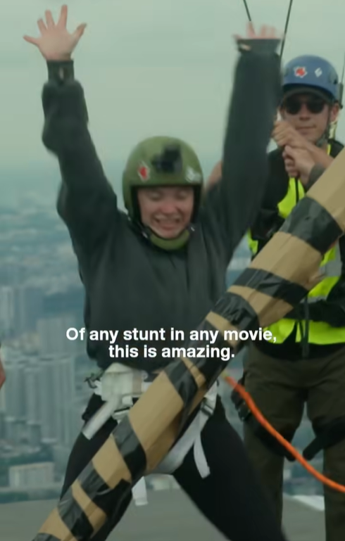 Apa yang mencuri tumpuan ramai adalah aksi terjunan lagak ngeri daripada pelakon utama, Florence Pugh dilakukan di menara Merdeka 118, menara kedua tertinggi di dunia.