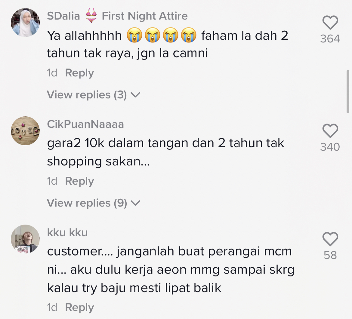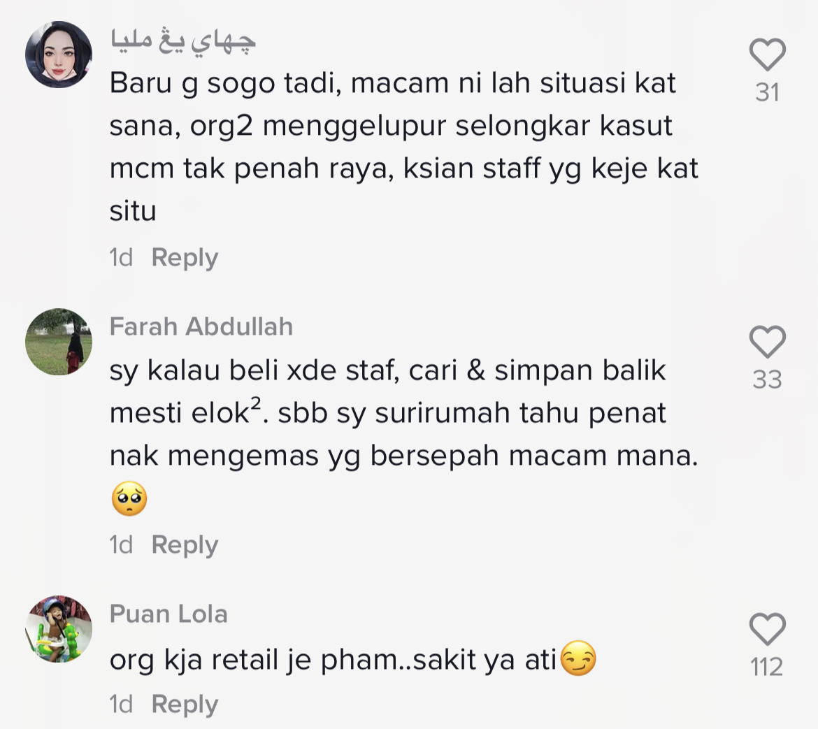 "Baru pergi Sogo tadi, macam ini lah situasi dekat sana. Orang ramai menggelupur selongkar kasut macam tak pernah raya. Kesian staff yang kerja kat situ" – Netizen