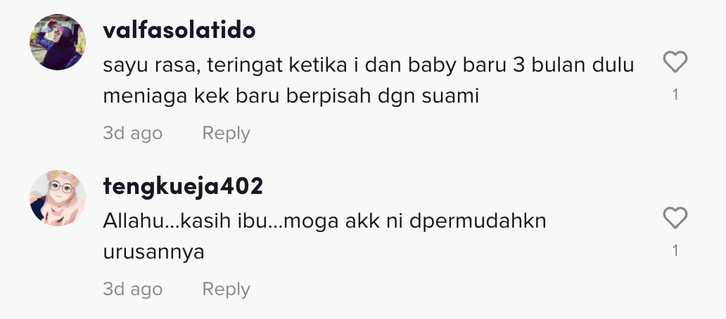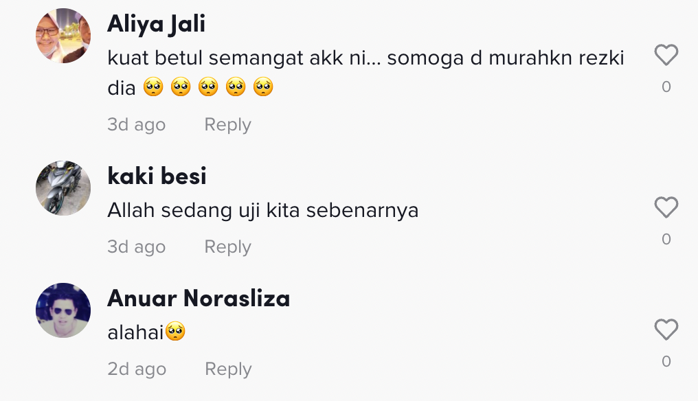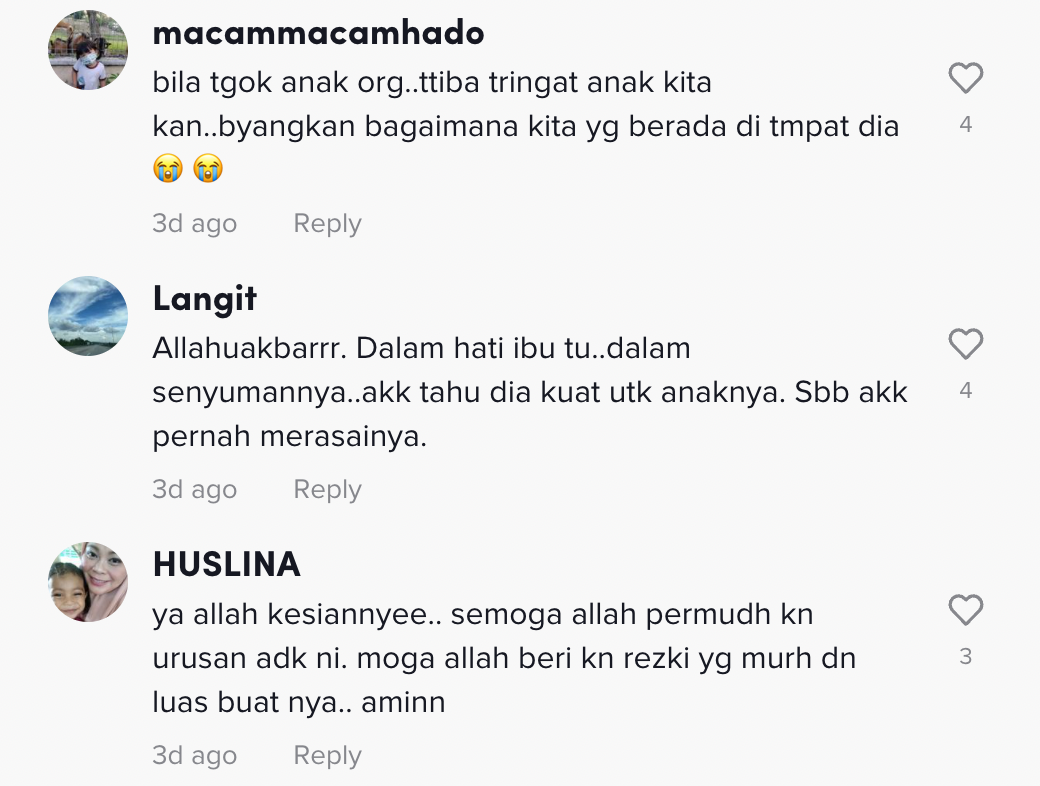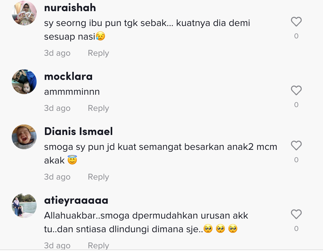 Dalam pada itu, tinjauan di ruangan komen mendapati rata-rata netizen turut meluahkan rasa sebak mereka melihat keadaan wanita tersebut.