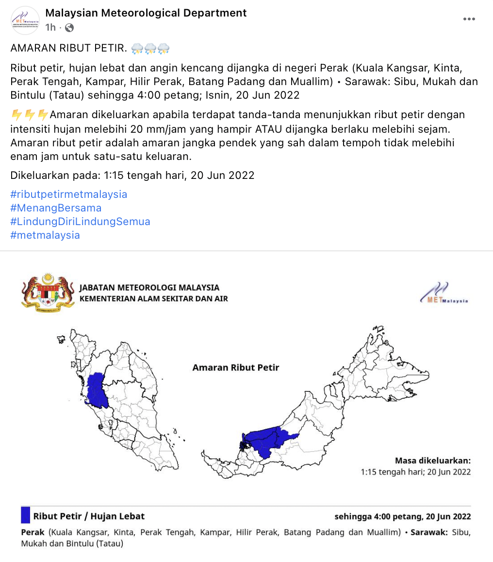 Menurut satu kenyataan di Facebook pada 11 pagi hari ini, METMalaysia memberi amaran cuaca buruk dijangka berlaku di Perak, Selangor dan Kuala Lumpur.