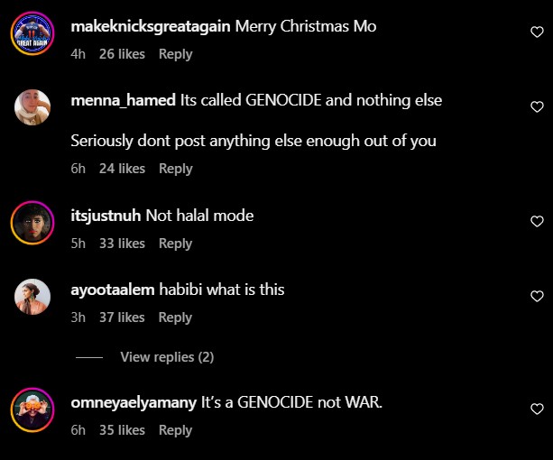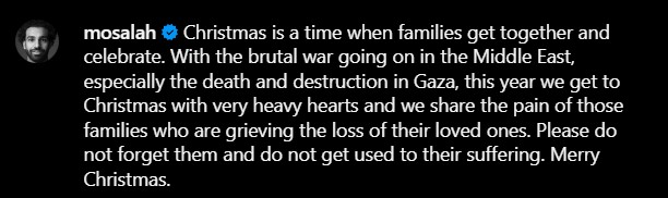 Dalam hantaran yang dilakukannya di Instagram itu, Salah turut menulis kapsyen menceritakan konflik yang berlaku di Palestin sebelum mengucapkan 'Merry Christmas' kepada pengikutnya.