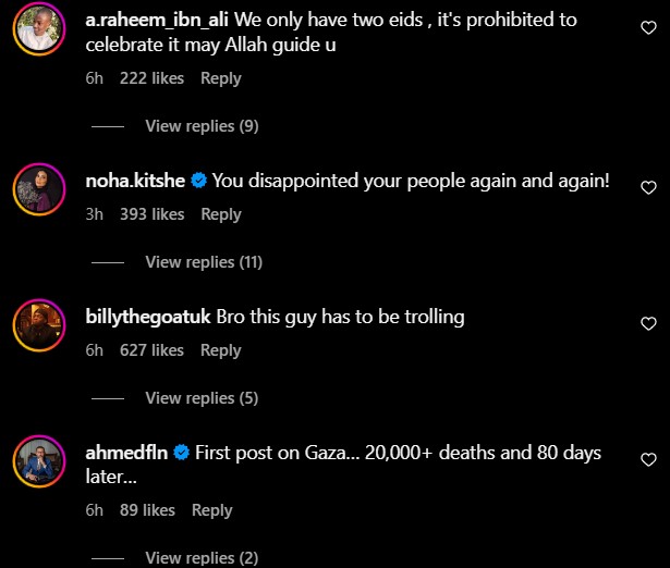 Menerusi tinjauan di bahagian komen, ramai pengikutnya yang beragama Islam dilihat memberi respon kecewa ke atas Salah selepas membuat hantaran itu.