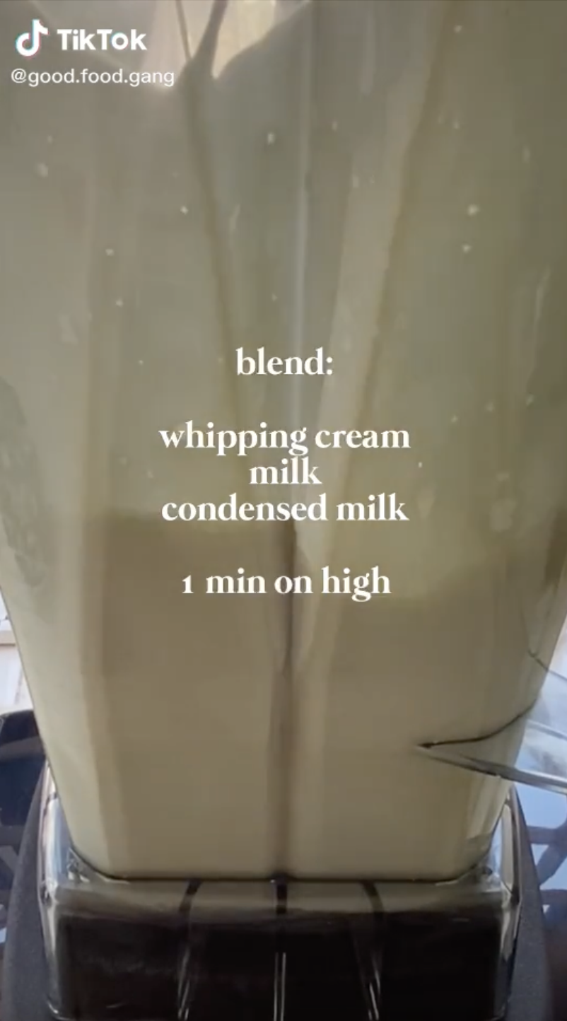 1. Masukkan 225ml whipping cream, 100ml susu segar dan 70ml susu pekat ke dalam pengisar dan blend selama 1 minit.