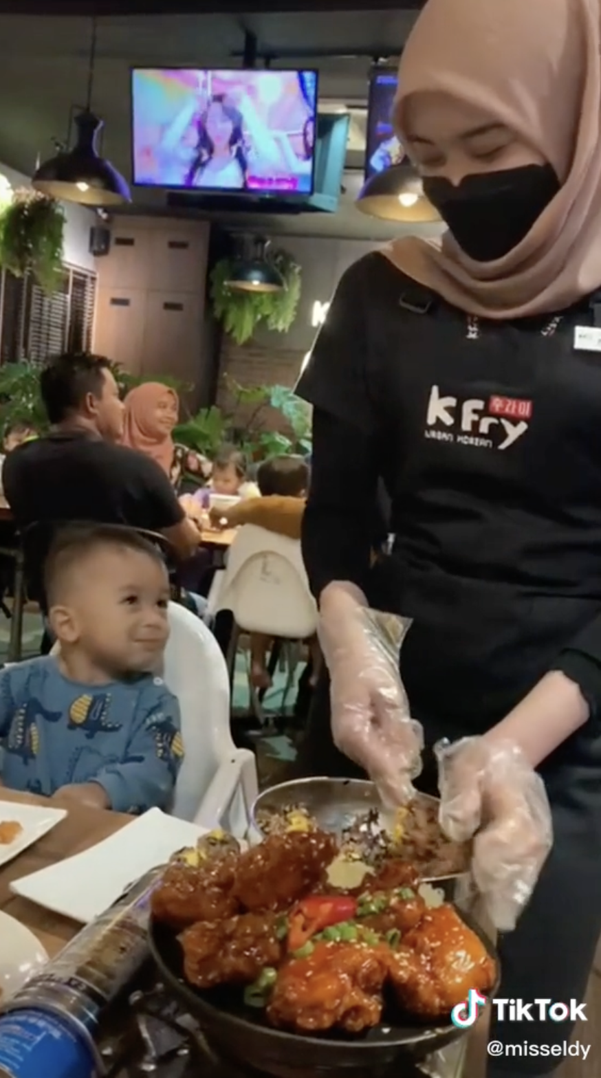 Lebih mencuit hati lagi adalah apabila budak lelaki tidak berkelip mata melihat pekerja itu menyiapkan makanan mereka. Malah, dia sempat membuat 'eye contact' sehingga budak itu tersenyum. Budak itu juga dilihat sempat menyentuh tangan pekerja wanita berkenaan.