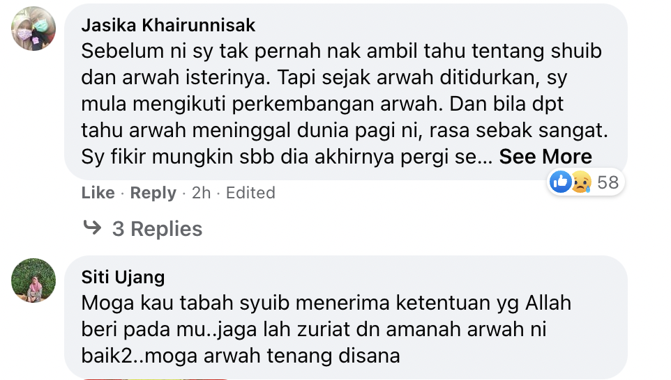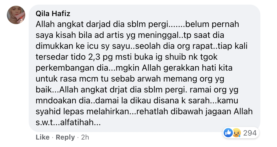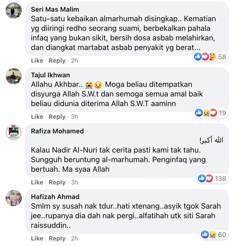 Dalam pada itu, tinjauan di ruangan komen mendapati rata-rata netizen turut meluahkan rasa sedih mereka dengan pemergian penyanyi tersebut. Malah, ramai yang mendoakannya agar ditempatkan dikalangan orang-orang beriman.
