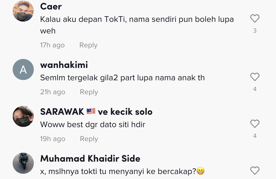 Situasi itu sama seperti video yang tular di TikTok ini apabila seorang wanita sehingga terlupa siapa nama anaknya ketika ditanya penyanyi nombor satu negara Dato Sri' Siti Nurhaliza telah mencuit hati ramai.