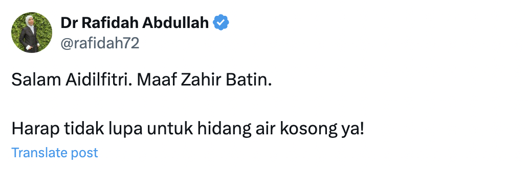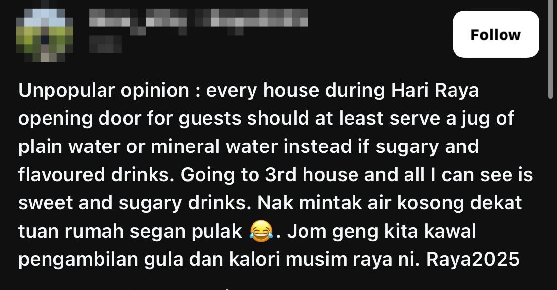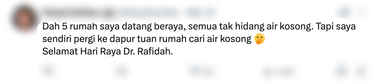 Malah, perkara itu turut diingatkan oleh Doktor Rafidah di laman X agar tuan rumah tidak lupa untuk menghidangkan air kosong selain daripada air yang manis.