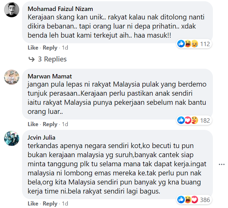 Selain itu, ada juga berpendapat bahawa kerajaan perlu prihatin dengan pekerjaan rakyat di Malaysia dulu sebelum membantu negara luar.