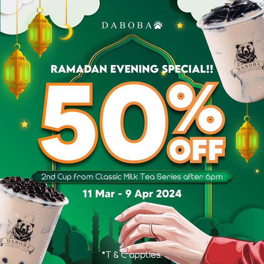 Sambut Ramadan dengan tawaran istimewa dari Daboba! Beli minuman dari Daboba's Milk Tea series dan nikmati minuman kedua anda dengan diskaun 50%!