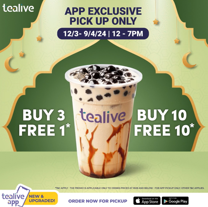 Hilangkan dahaga dan redakan panas dengan promosi Ramadan ini. Jika anda merancang untuk berbuka puasa bersama dengan rakan-rakan atau keluarga, anda boleh menjimatkan wang dengan promosi pakej istimewa mereka melalui aplikasi Tealive. Beli tiga minuman dan dapatkan satu minuman secara percuma.