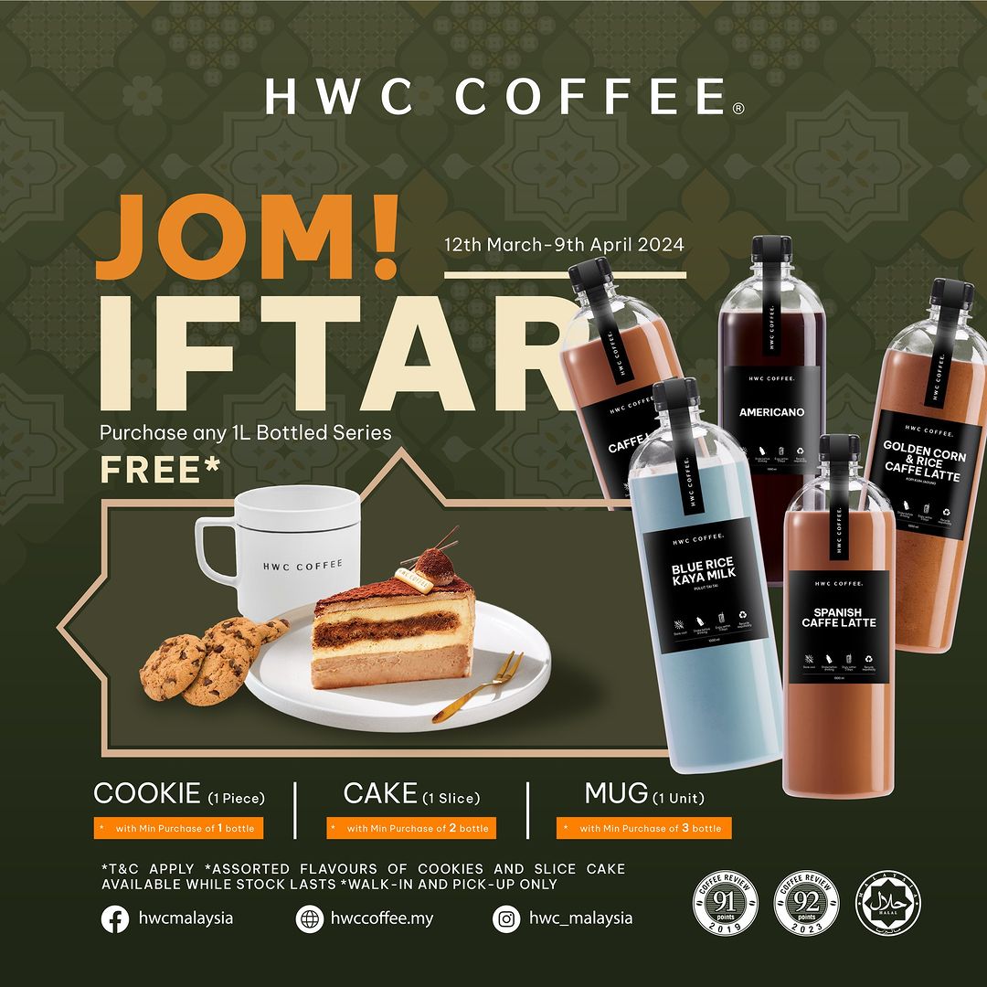 Beli minuman satu liter dari Siri Botol HWC Coffee dan dapatkan hidangan percuma, pilih antara biskut, satu potongan kek atau Mug eksklusif HWC.