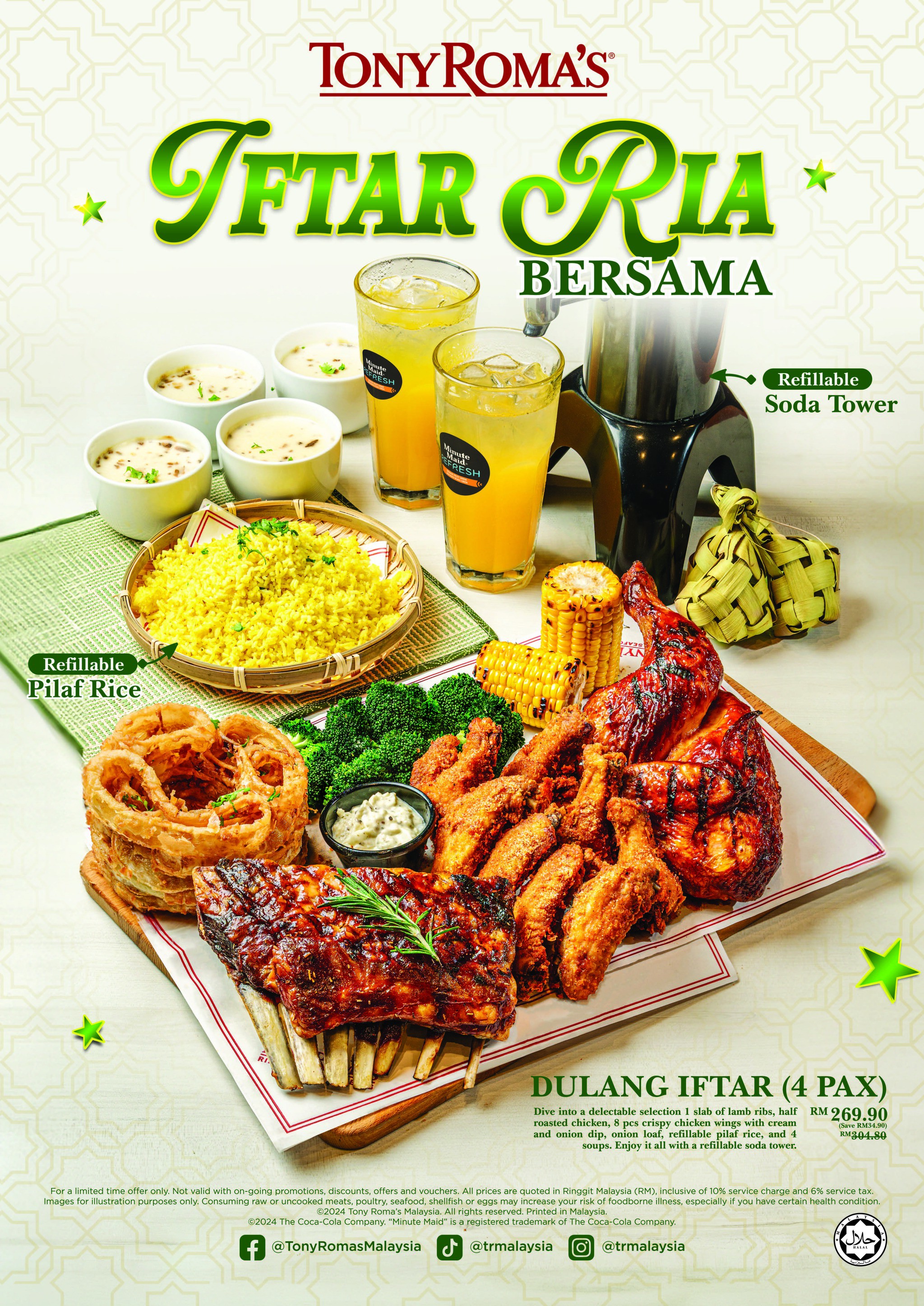 Sambut bulan Ramadan dengan menu 'Iftar Ria Bersama' baru dari Tony Roma's. Dari crispy chicken wings hingga hidangan utama untuk empat orang, ini tempat yang sempurna untuk makan bersama keluarga anda.
