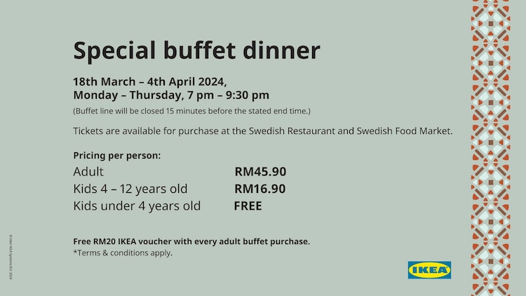 Nikmatilah hidangan berbuka puasa dengan buffet Iftar IKEA yang lazat, termasuk nasi kerabu, mee soto, dan lain-lain. Anda juga akan menemui hidangan kegemaran IKEA seperti daging berkeju lingonberry, sup cendawan dan ayam panggang.