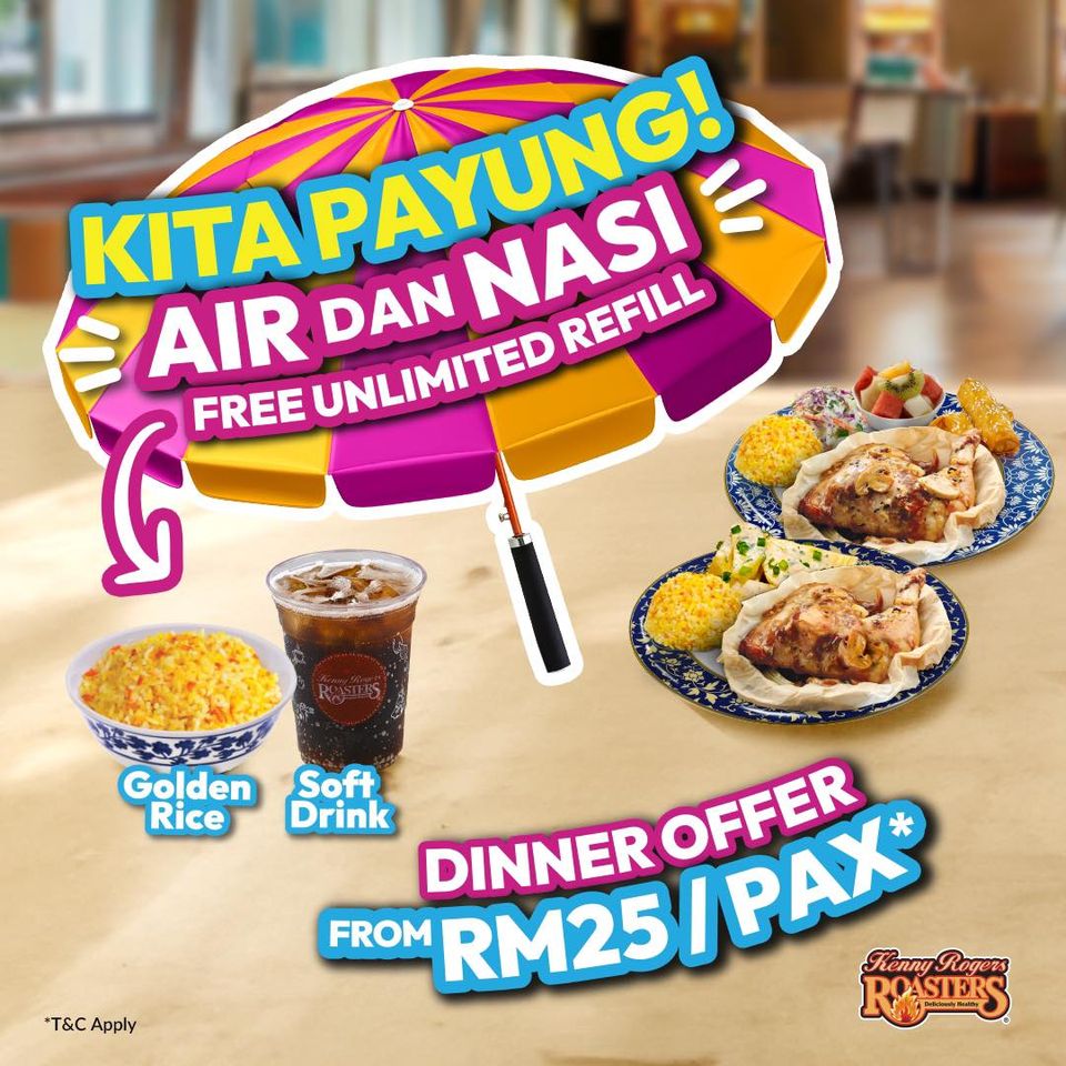 Nikmatilah Promosi Kita Payung dari Kenny Rogers ROASTERS (KRR)! Setiap set termasuk Paper Chicken Wrapped yang terkenal, Chicken Clear Soup, serta unlimited refills nasi dan minuman, dengan harga bermula dari RM25.