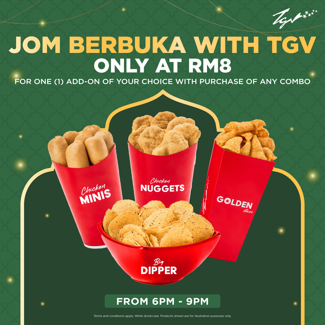 Tiada lawatan ke panggung wayang yang lengkap tanpa snek panggung! Beli mana-mana kombo dan dapatkan tambahan pilihan termasuk Chicken Minis, Big Dipper, Chicken Nuggets, dan Golden Star Chips dengan hanya RM8 sahaja!