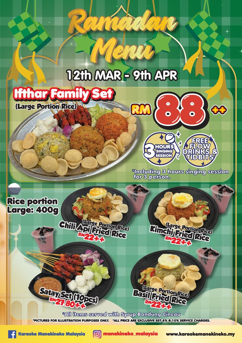 Karaoke Manekineko sedia untuk berkhidmat untuk anda dan keluarga semasa bulan Ramadan. Dengan pesanan Set Ifthar Keluarga pada harga RM88, anda hanya perlu bayar untuk tiga orang untuk sesi karaoke selama tiga jam. Anda juga akan menikmati minuman dan snek tanpa batasan.