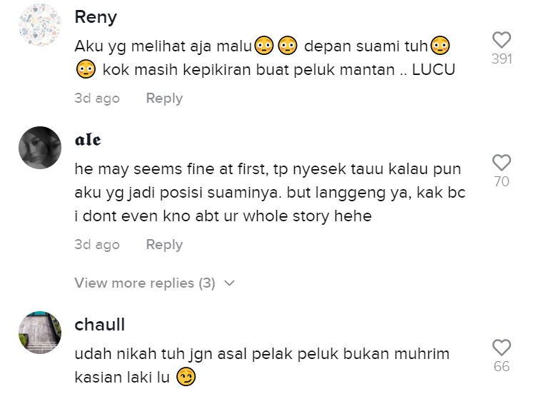 Suami dia pun macam cool je tengok isteri dia dengan ex tu. Tapi dalam hati dia tak tahulah macam mana kan 🙂