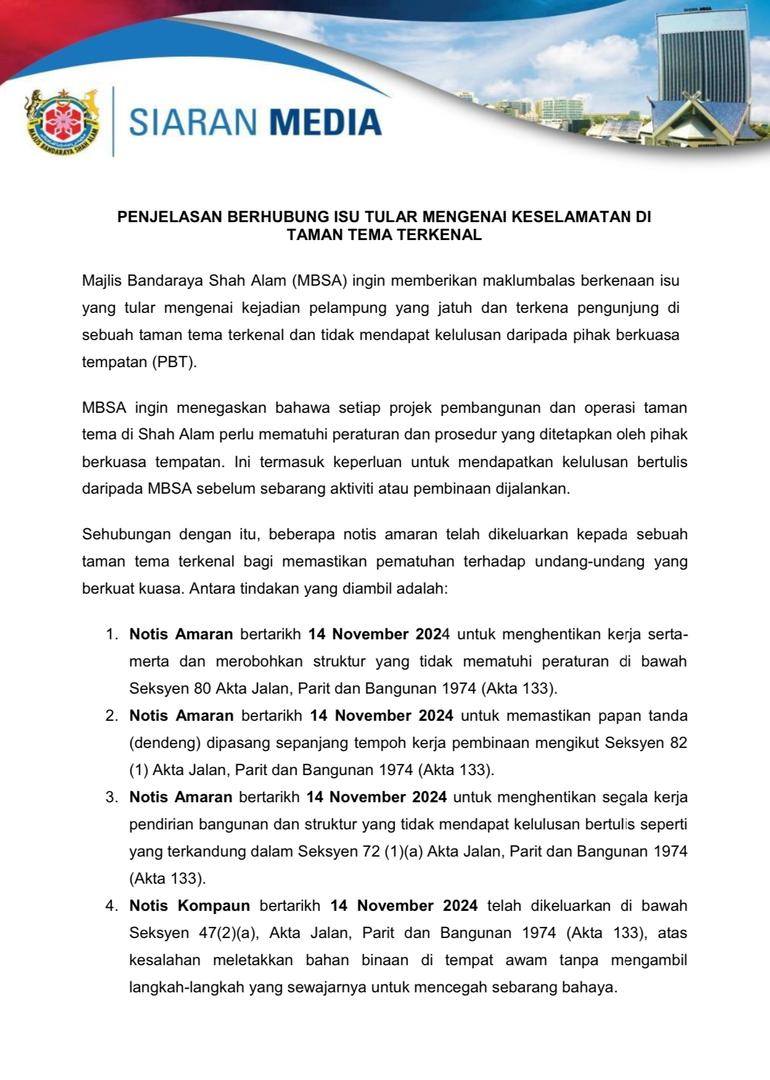 "Yang Amat Berhormat Dato' Seri Amirudin bin Shari, Menteri Besar Selangor menegaskan bahawa pihak kerajaan Negeri Selangor akan memanggil semula pihak pengurusan taman tema tersebut dan operasinya akan dihentikan serta merta, sehingga operator terbabit dapat memenuhi spesifikasi yang telah ditetapkan oleh pihak Majlis Bandaraya Shah Alam (MBSA).