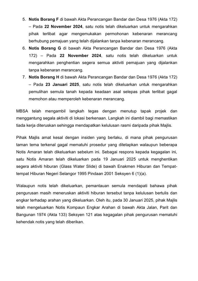 "Untuk makluman, penutupan sudah dilakukan selepas lawatan turun padang oleh pengurusan tertinggi MBSA diketuai oleh Pemangku Timbalan Datuk Bandar MBSA, Madiyan Baweh; Ahli Majlis MBSA, Maizan Abdul Majid, dan Polis Diraja Malaysia (PDRM) pada 31 Januari lalu jam 5.30 petang.