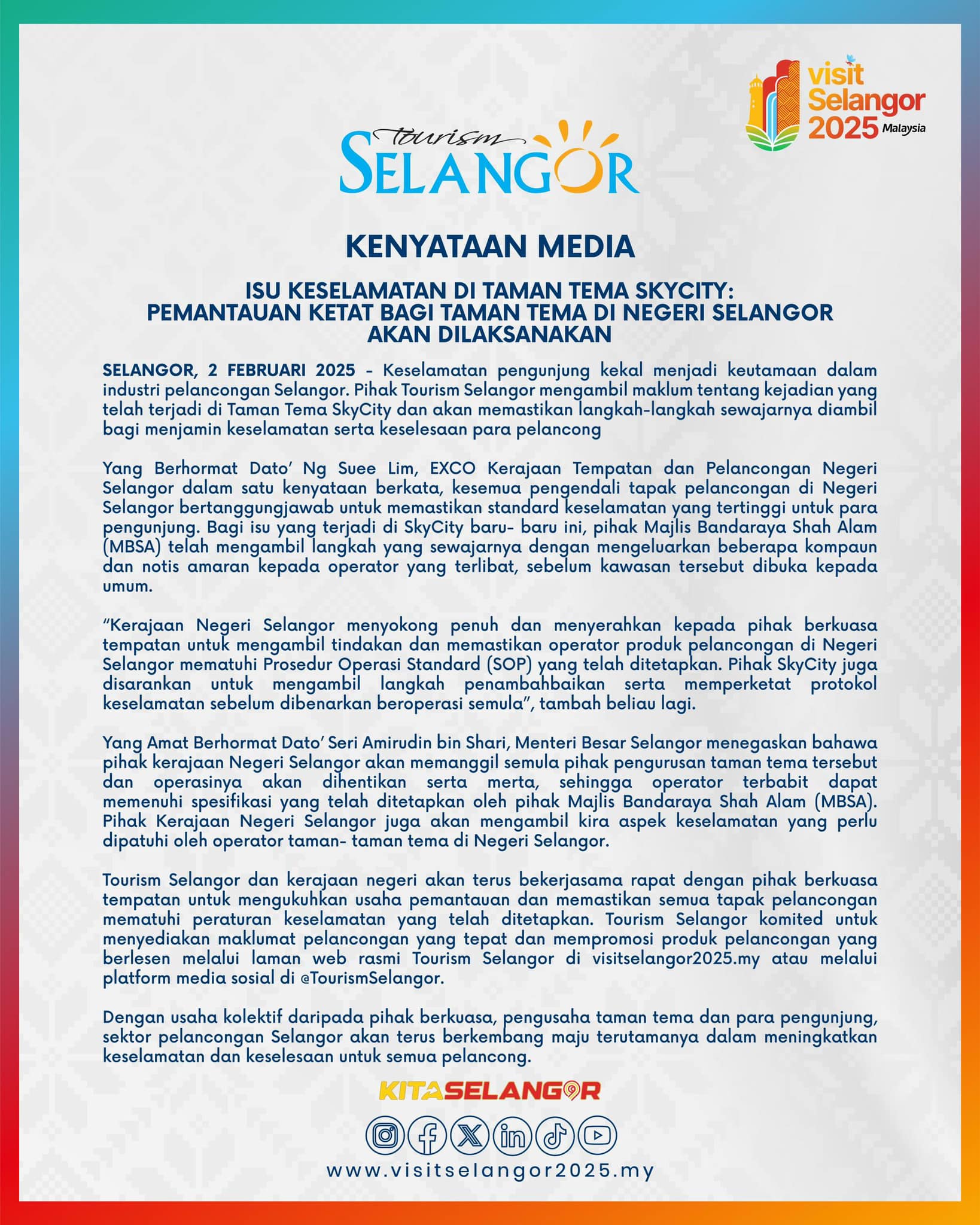 "Keselamatan pengunjung kekal menjadi keutamaan dalam industri pelancongan Selangor. Pihak Tourism Selangor mengambil maklum tentang kejadian yang telah terjadi di Taman Tema SkyCity dan akan memastikan langkah-langkah sewajarnya diambil bagi menjamin keselamatan serta keselesaan para pelancong.