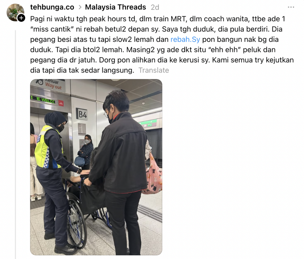 "Saya yang pengsan dalam MRT semalam. Terima kasih kerana membantu saya. Saya amat hargai semua yang membantu.