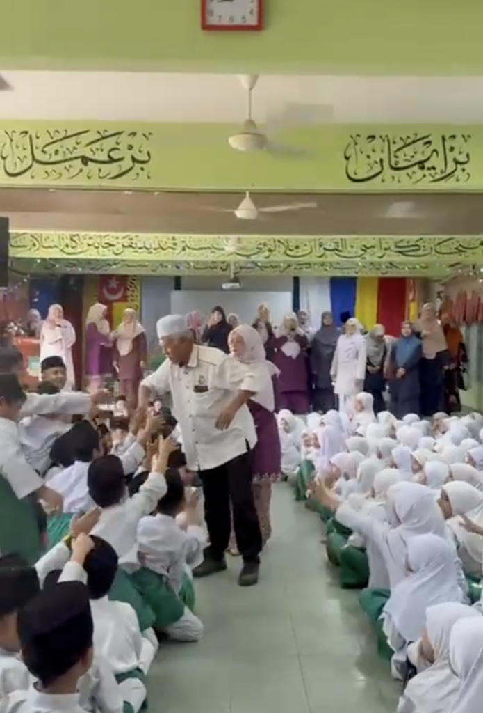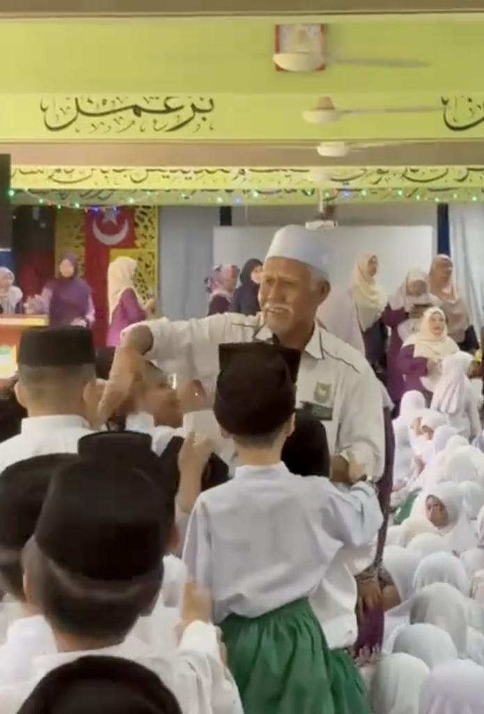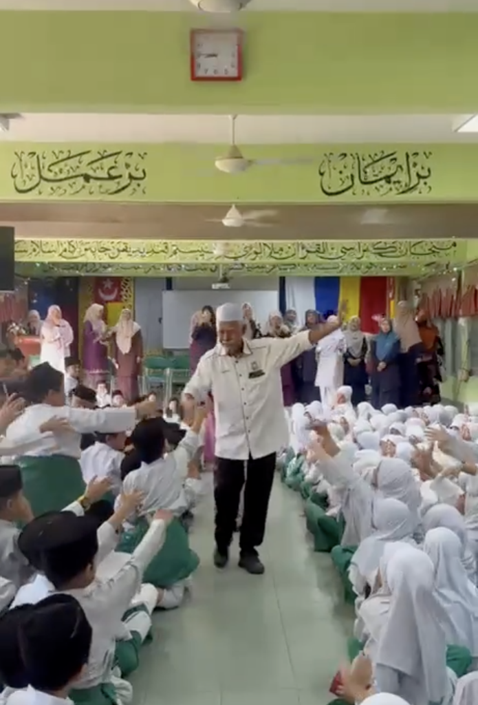 Dalam rakaman tersebut, kelihatan wajah murid-murid yang sebak dan terharu sewaktu pak cik guard itu berjalan keluar dari dewan