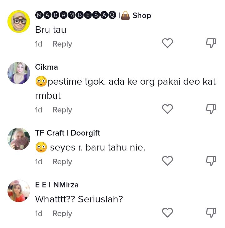 Bukan setakat itu sahaja, gadis itu juga menyatakan faedah-faedah penggunaan *deodorant* pada rambut dalam video tersebut.