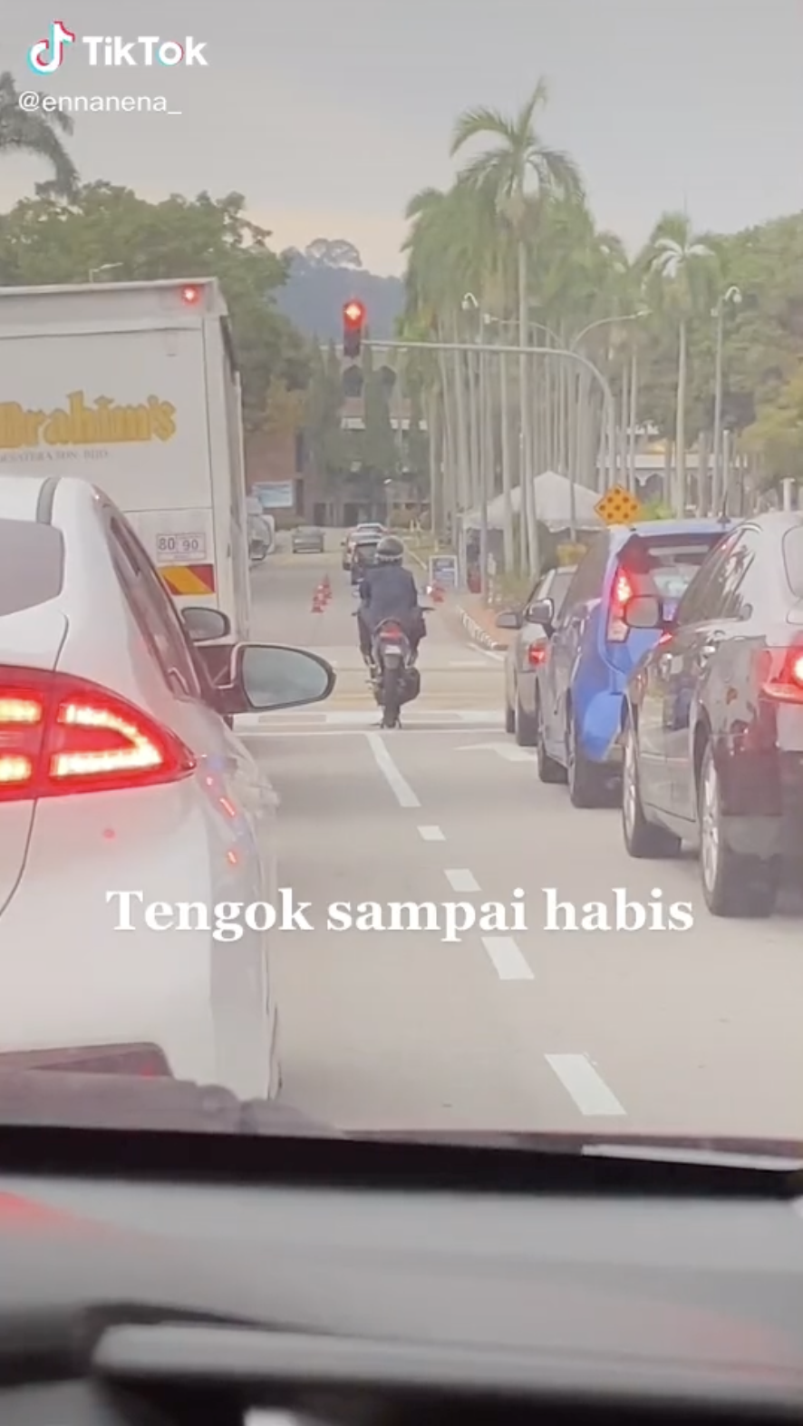 Namun, lain pual dengan video yang tular di TikTok ini apabila seorang lelaki dilihat dengan rileksnya meletakkan double stand ketika lampu isyarat merah mencuri tumpuan ramai.