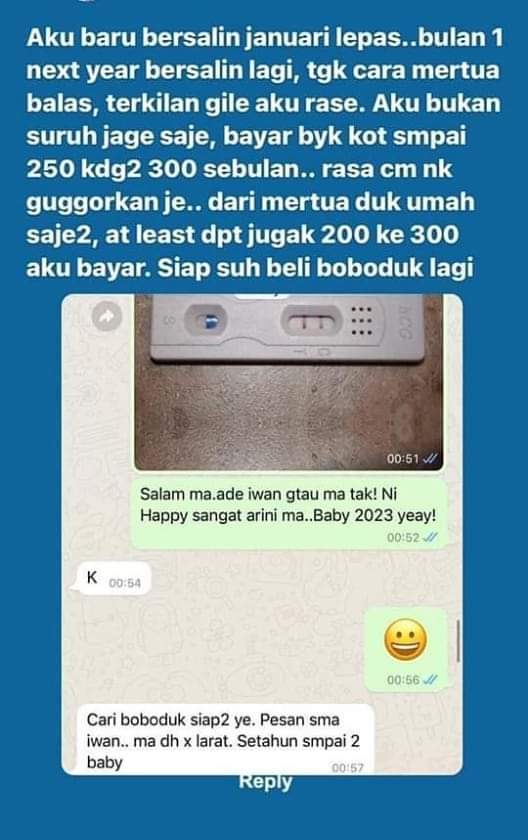 Dia memberitahu ibu mentuanya itu yang dia akan mendapat baby baru. Namun, reaksi si ibu menjawab pula seolah-olah seperti biasa dan memesan agar dia mencari pengasuh siap-siap kerana penat menjaga anak mereka.
