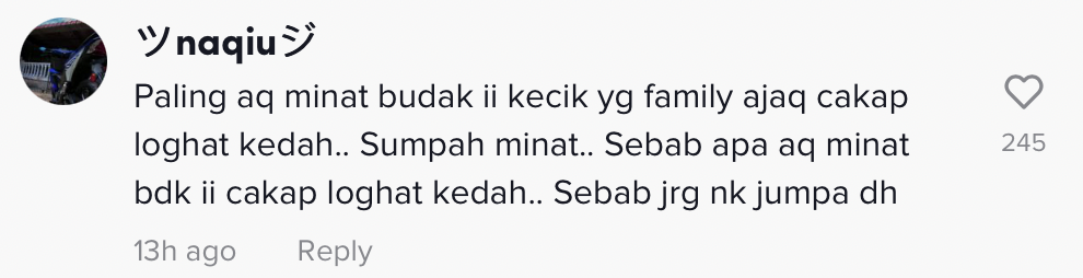 Susulan tularnya video tersebut yang kini meraih sehingga 356.2K tontonan, 30.7K tanda suka dan 407 komen di TikTok, rata-rata netizen turut terpegun mendengar kefasihan budak perempuan itu bercakap menggunakan loghat Kedah.