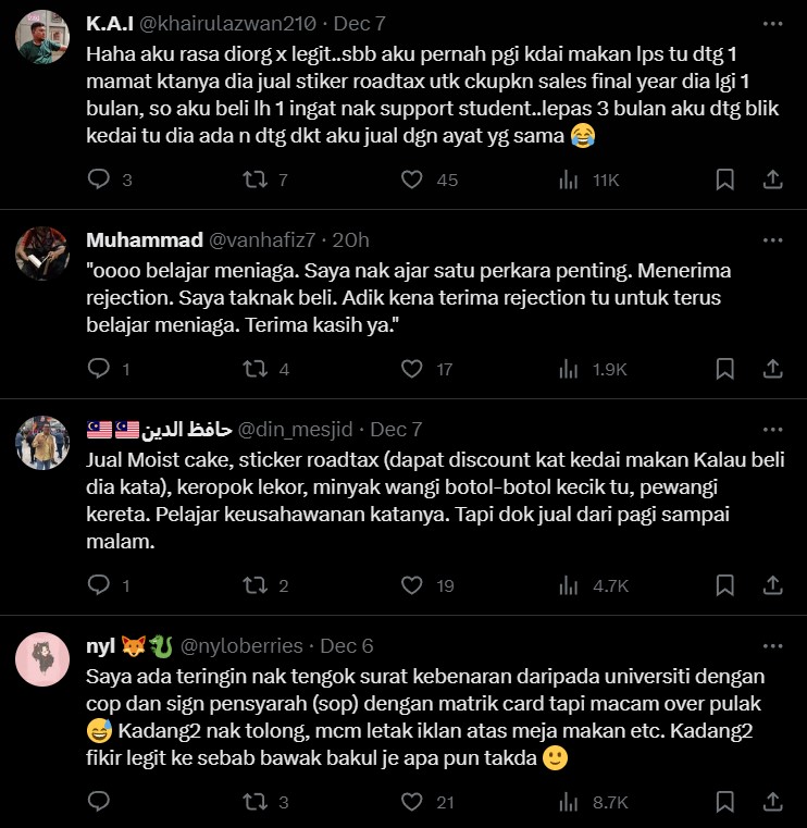 "This semester I take subject Entrepreneurship mostly student jual dekat campus je or ada lah online jugak. Jarang dengar yang jalan pergi jual kedai ke kedai ni. Mostly letak je product tu dekat kedai je" – Netizen