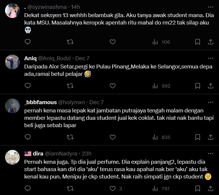 Perkara ini telah menjadi sebuah perbincangan di laman X apabila tular sebuah ciapan yang mempersoalkan kesahihan individu yang mengaku diri mereka pelajar universiti dan bukannya sebuah sindiket.