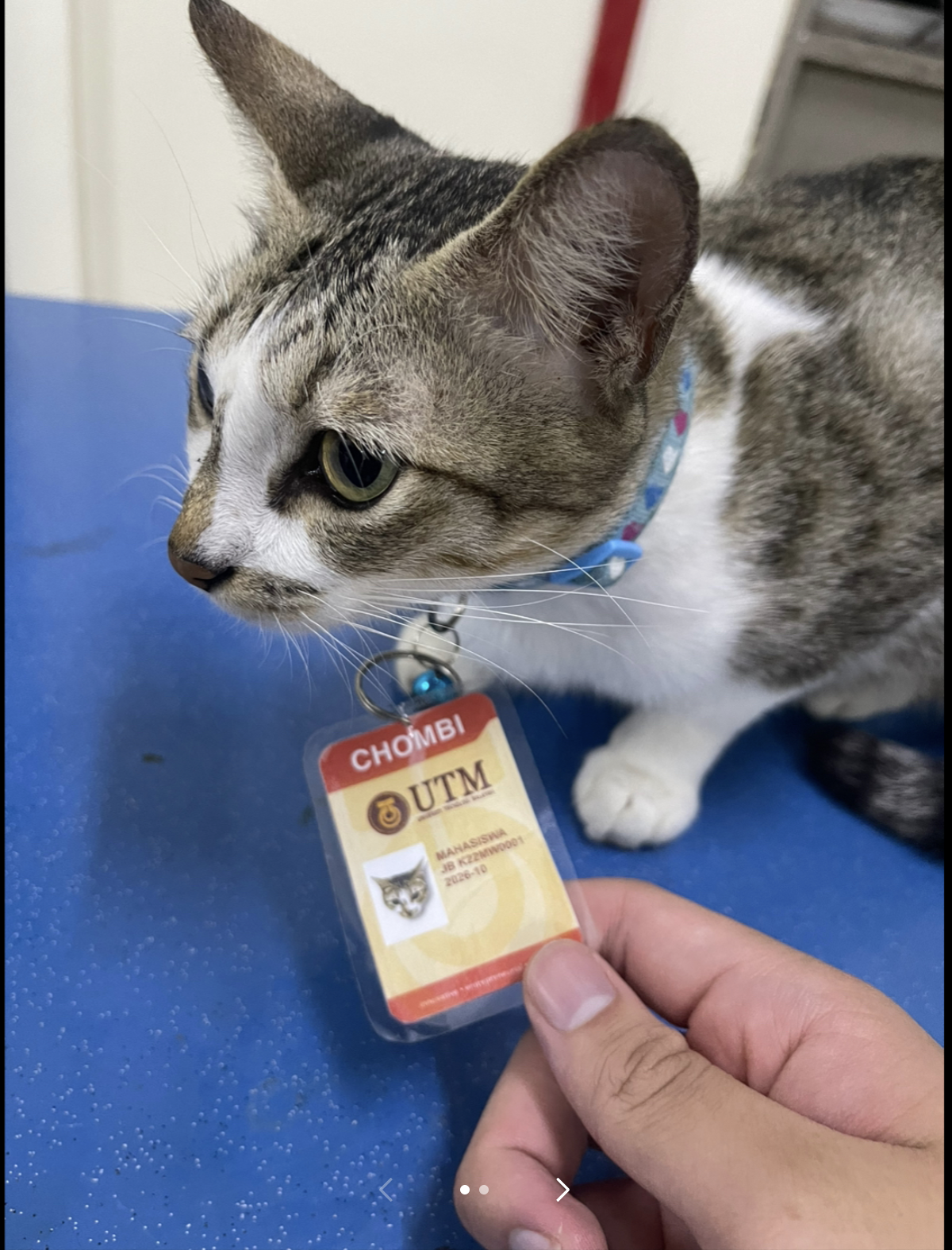 Dia berkongsi beberapa foto seekor kucing yang berkeliaran di sekitar institusinya di Kulai. Bukan sebarang kucing, si comel ini mempunyai kad nama dan tag sendiri dengan penerangan penuh tentang program pendidikannya.