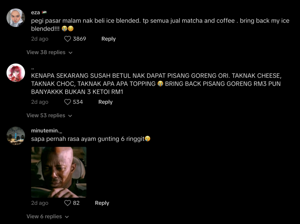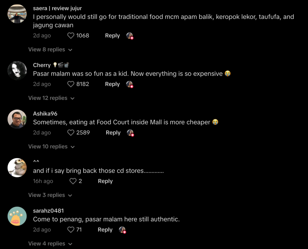 Pengguna TikTok lain juga merindukan makanan tradisional seperti Apam Balik, Keropok Lekor, Taufufa dan jagung cawan malah ada yang mengatakan suasana pasar malam ketika sedekad lalu lebih indah berbanding sekarang di mana semuanya mahal.