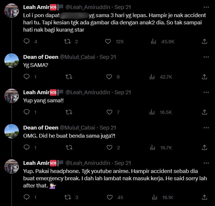 Baru-baru ini, tular sebuah hantaran di Twitter oleh @Mulut_Cabai berkongsi pengalamannya menggunakan perkhidmatan e-hailing yang pada mulanya mendapat tanggapan pertama baik oleh lelaki itu namun selepas beberapa minit perkara sebaliknya berlaku.