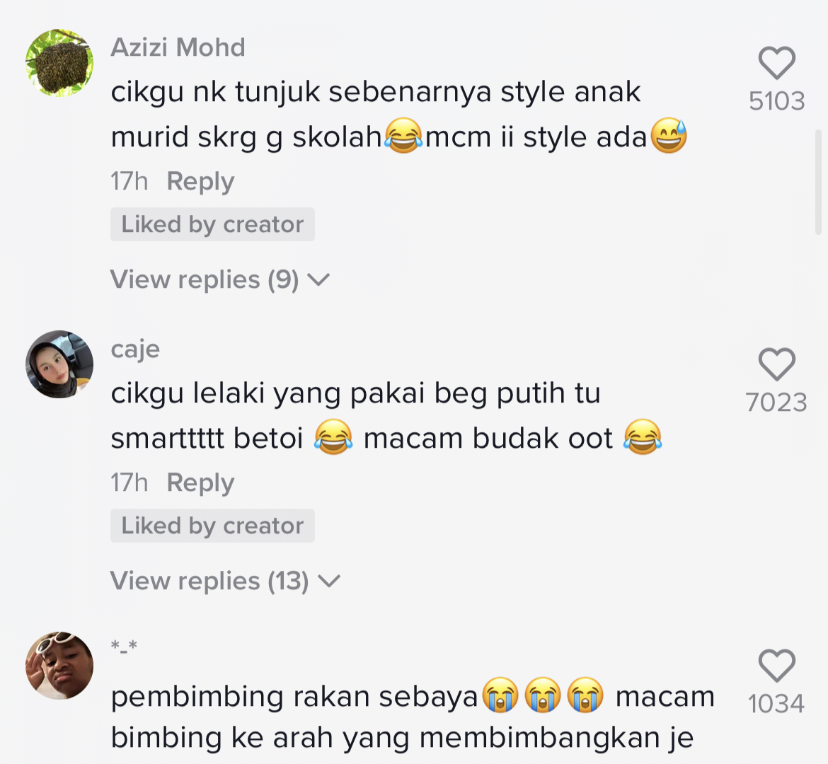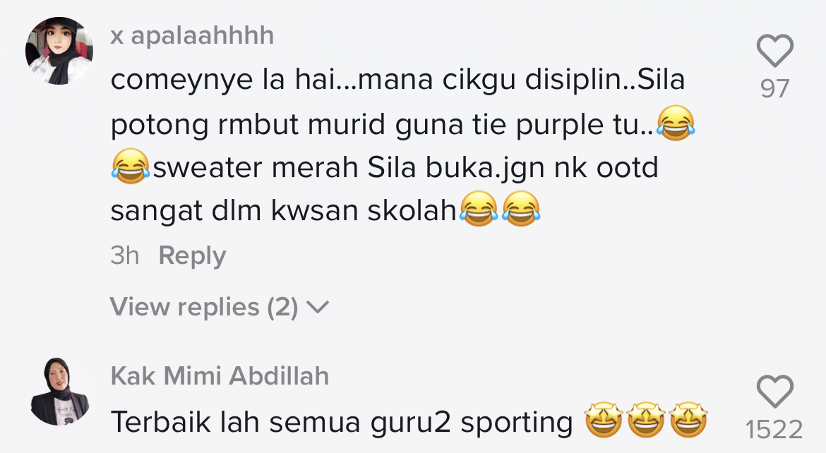 "Comelnya la hai. Mana cikgu disiplin? Sila potong rambut pelajar yang pakai tie purple tu. Yang pakai sweater merah tu sila buka ya, jangan nak OOTD sangat dalam kawasan sekolah" – Netizen