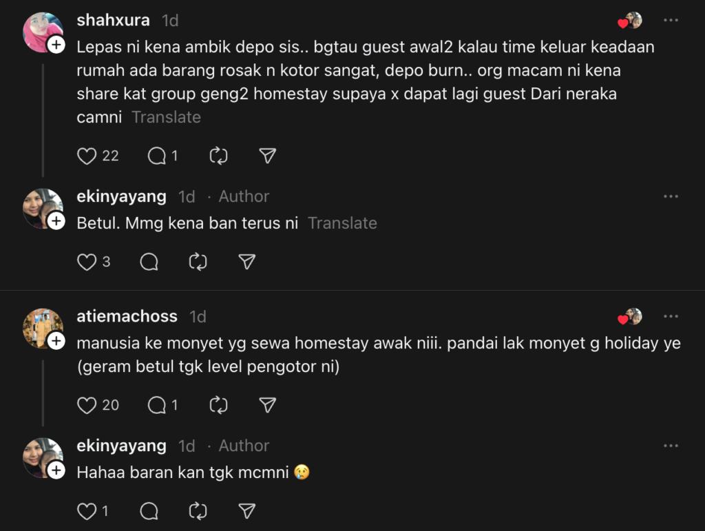 Luahan itu dikongsikan oleh wanita bernama Ekin di laman Threads, di mana dia turut memuat naik beberapa foto yang menunjukkan keadaan homestaynya di Tanah Rata, Cameron Highlands.