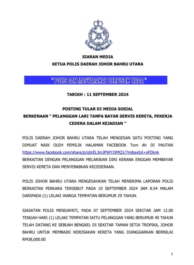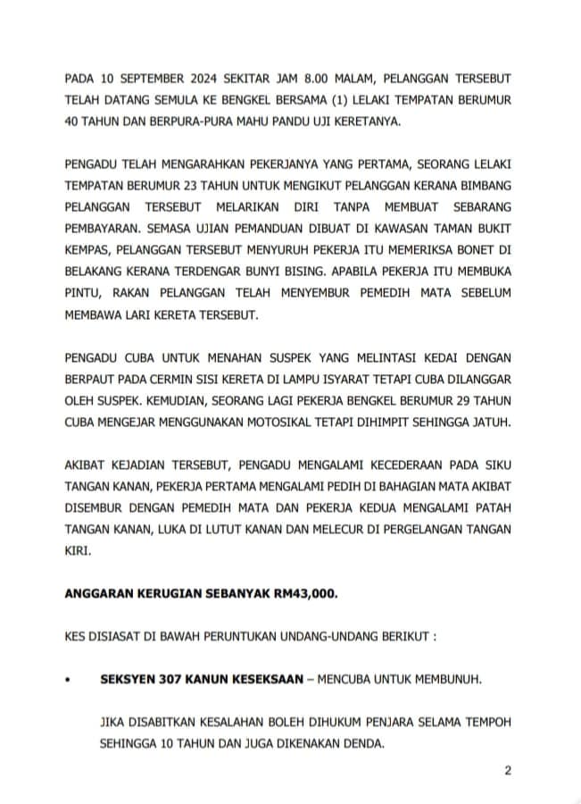 "Berdasarkan laporan itu, Sabtu lalu kira-kira 12 tengah hari, lelaki berusia 40-an datang ke bengkel mangsa untuk membaiki kerosakan kereta yang dianggarkan bernilai RM38,000.