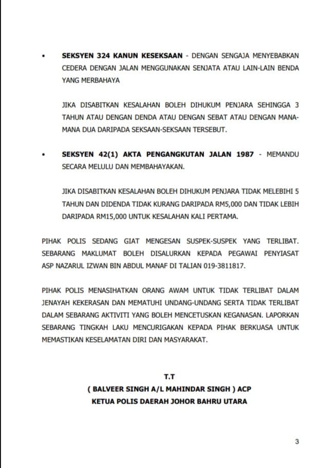 Pihak polis kini giat mengesan kedua-dua suspek dan kes disiasat di bawah Seksyen 307 dan Seksyen 324 Kanun Keseksaan serta Seksyen 42(1) Akta Pengangkutan Jalan 1987.