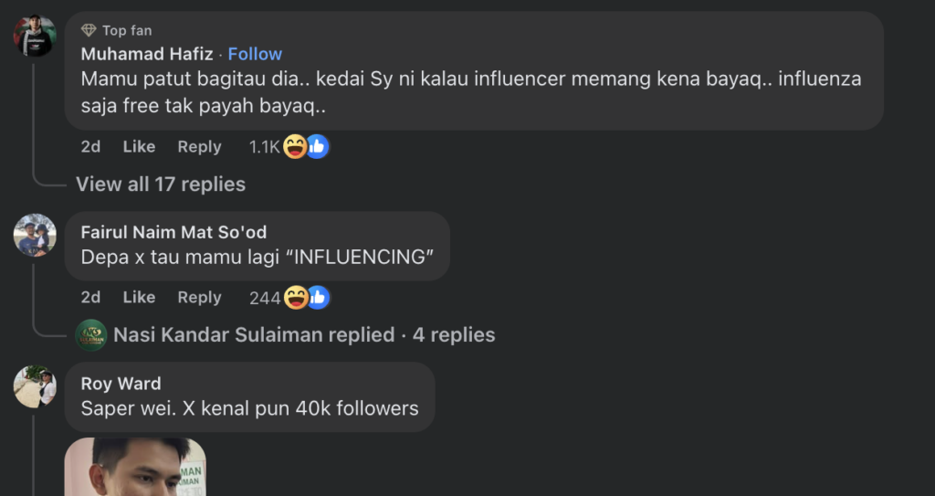 Ada juga yang mempersoalkan kredibiliti individu yang menggunakan gelaran influencer untuk mendapatkan manfaat peribadi, terutama apabila pengaruh dan pengikut mereka tidak begitu besar.