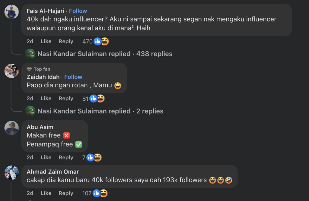 "Ada seorang pelanggan ini datang bersama keluarga. Sebelum makan beliau datang kepada saya kata 'saya influencer'. Saya pun kata ok. Lalu beliau pun tunjuk TikTok acc beliau di mana beliau mempunyai follower dalam 40K.