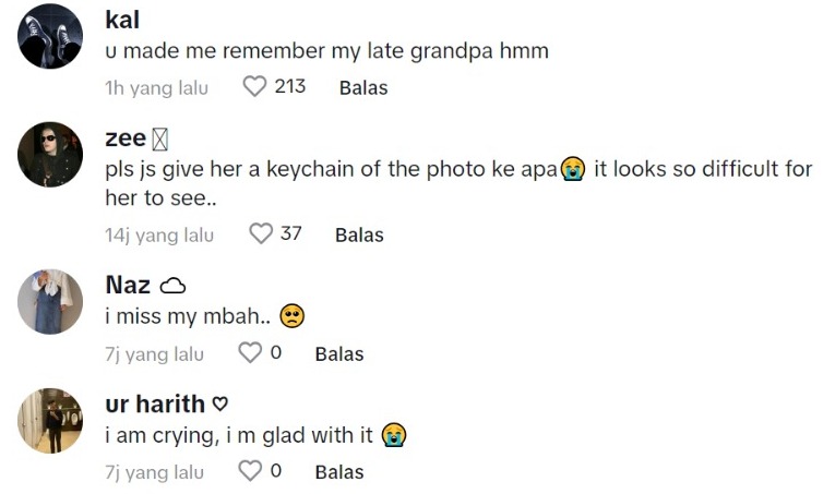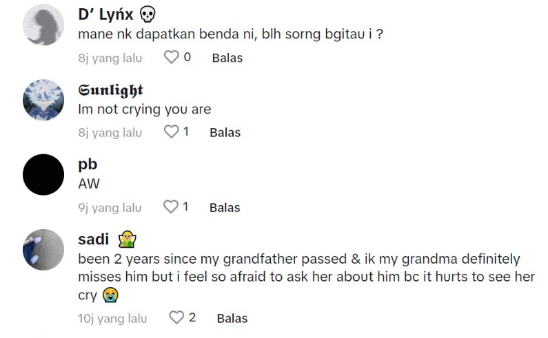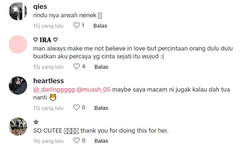 Dalam pada itu, tinjauan di ruangan komen mendapati rata-rata netizen turut sebak melihat neneknya yang amat merindui suaminya dan ada juga yang terharu melihat "cinta sejati" antara mereka.