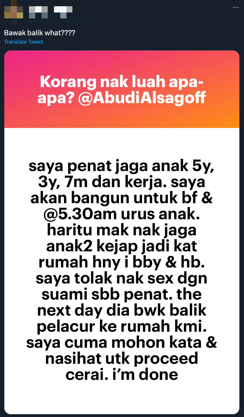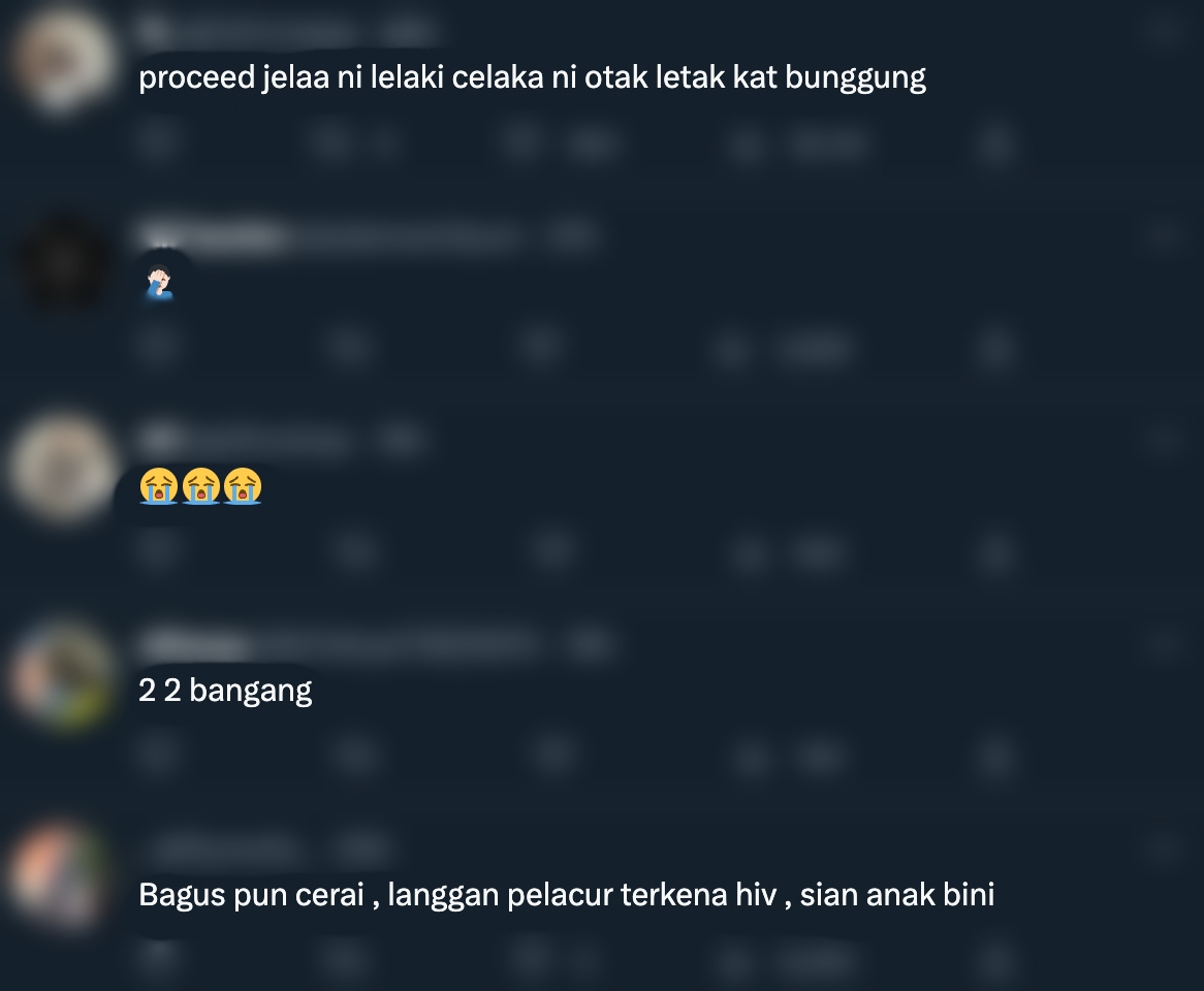 "The next day dia bawa balik pelacur ke rumah kami. Saya cuma mohon kata dan nasihat untuk proceed cerai. I'm done," tulisnya.