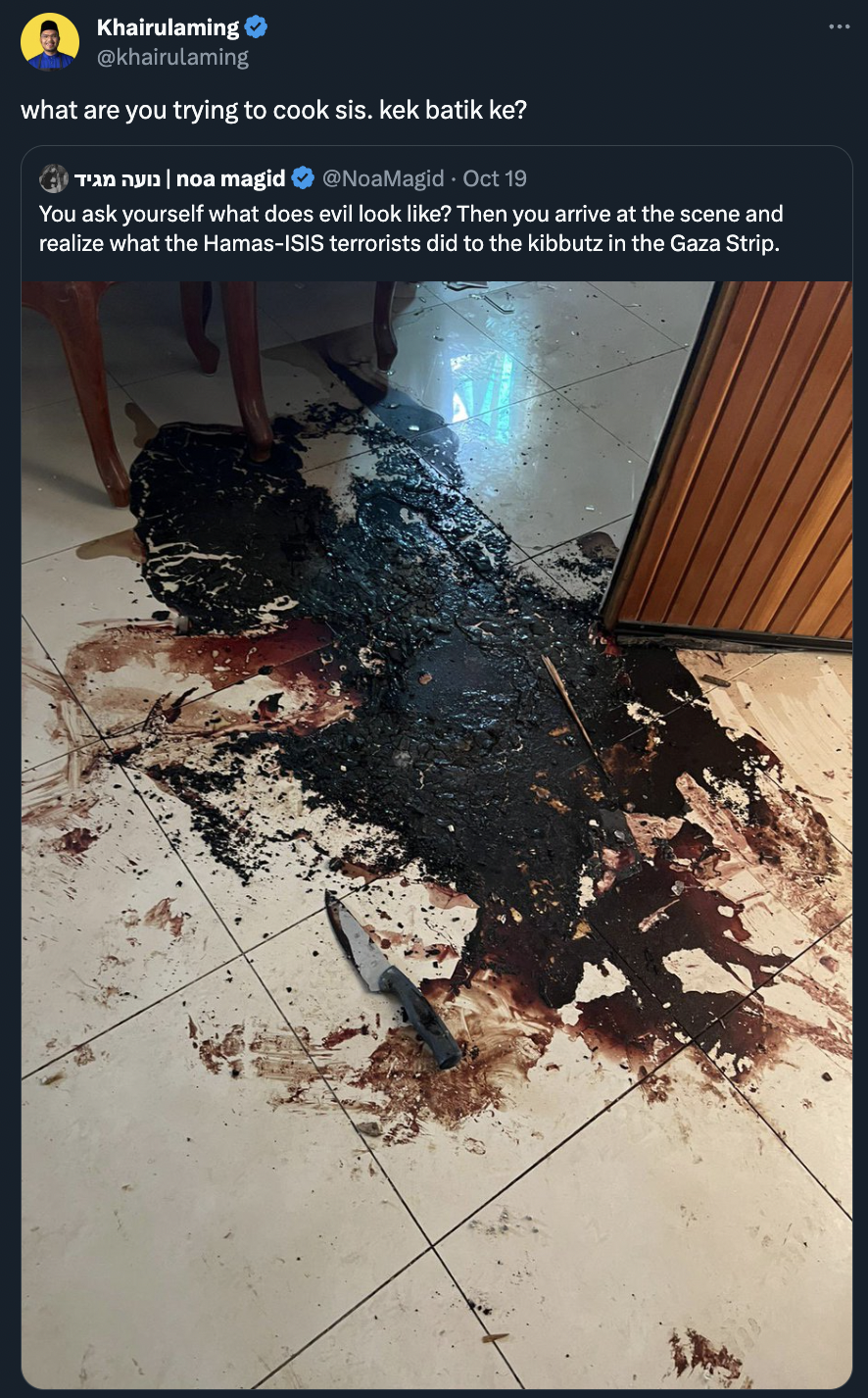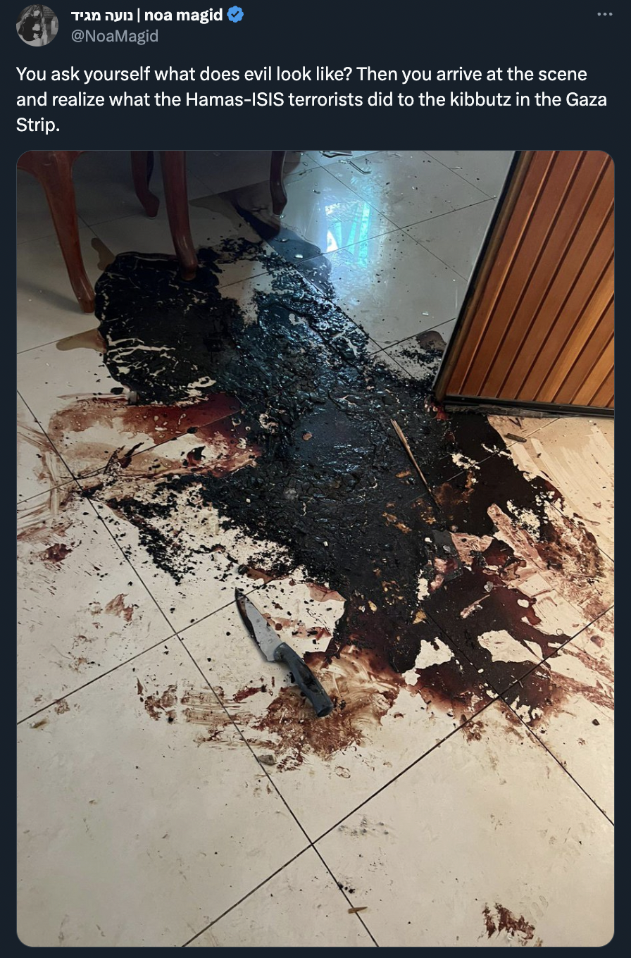 Dalam gambar yang dikongsikan di laman X itu, seorang individu telah mendakwa kediamannya telah diserang Hamas sehingga berlaku pertumpahan darah.