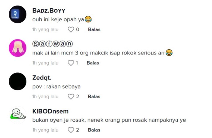 Namun, apa yang paling mencuit hati adalah nenek-nenek tersebut dilihat selamba menghisap puntung rokok yang tidak dinyalakan seperti acah-acah menghisapnya dan menunjukkannya ke arah kamera.