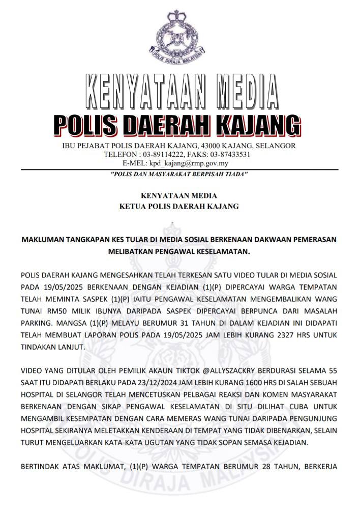 Menerusi kenyataan di Facebook, Ketua Polis Daerah Kajang Asisten Komisioner Naazron Abdul Yusof memberitahu pihaknya terkesan rakaman video yang memaparkan seorang wanita meminta pengawal keselamatan itu memulangkan wang RM50 milik ibunya.