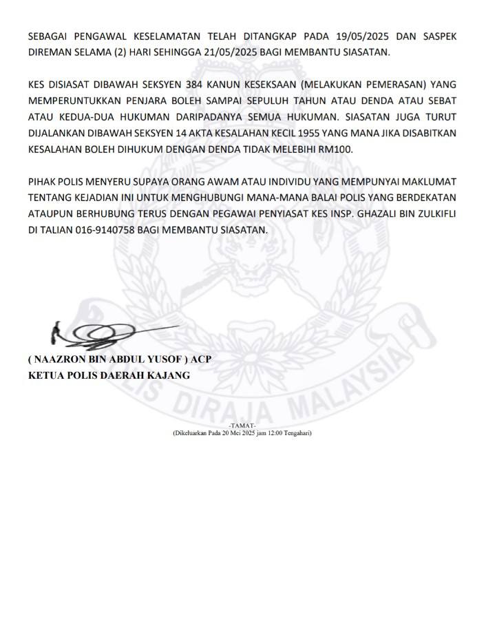 Tambahnya, wanita terbabit direman dua hari bermula hari ini sehingga esok bagi siasatan mengikut Seksyen 384 Kanun Keseksaan dan Seksyen 14 Akta Kesalahan Kecil 1955.